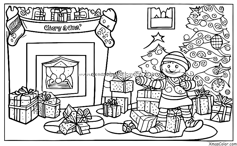 Santa is coming down the chimney head first. His arms and legs are outstretched. He has a big sack of presents over his shoulder. The fireplace is blazing with a warm fire.