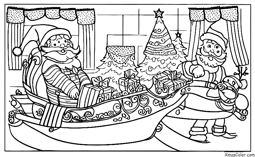 Santa is waving goodbye as he starts his long journey around the world. His sleigh is full of presents, and his reindeer are ready to go.